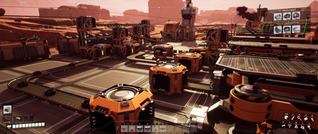 Kolejnym minusem według mnie, jest konieczność budowania przeogromnych fabryk, a jeśli nie zoptymalizujmy ich dobrze, to z biegiem czasu powstaje tzw. „spaghetti”. Jest to gmatwanina naszych taśmociągów, która powstaje przez nawarstwianie się kolejnych maszyn, by stworzyć compenent, który potrzebny jest do naszych misji. Odblokowując wyższe poziomy naszych maszyn wydobywczych, rośnie zapotrzebowanie na maszyny je przetwarzające.